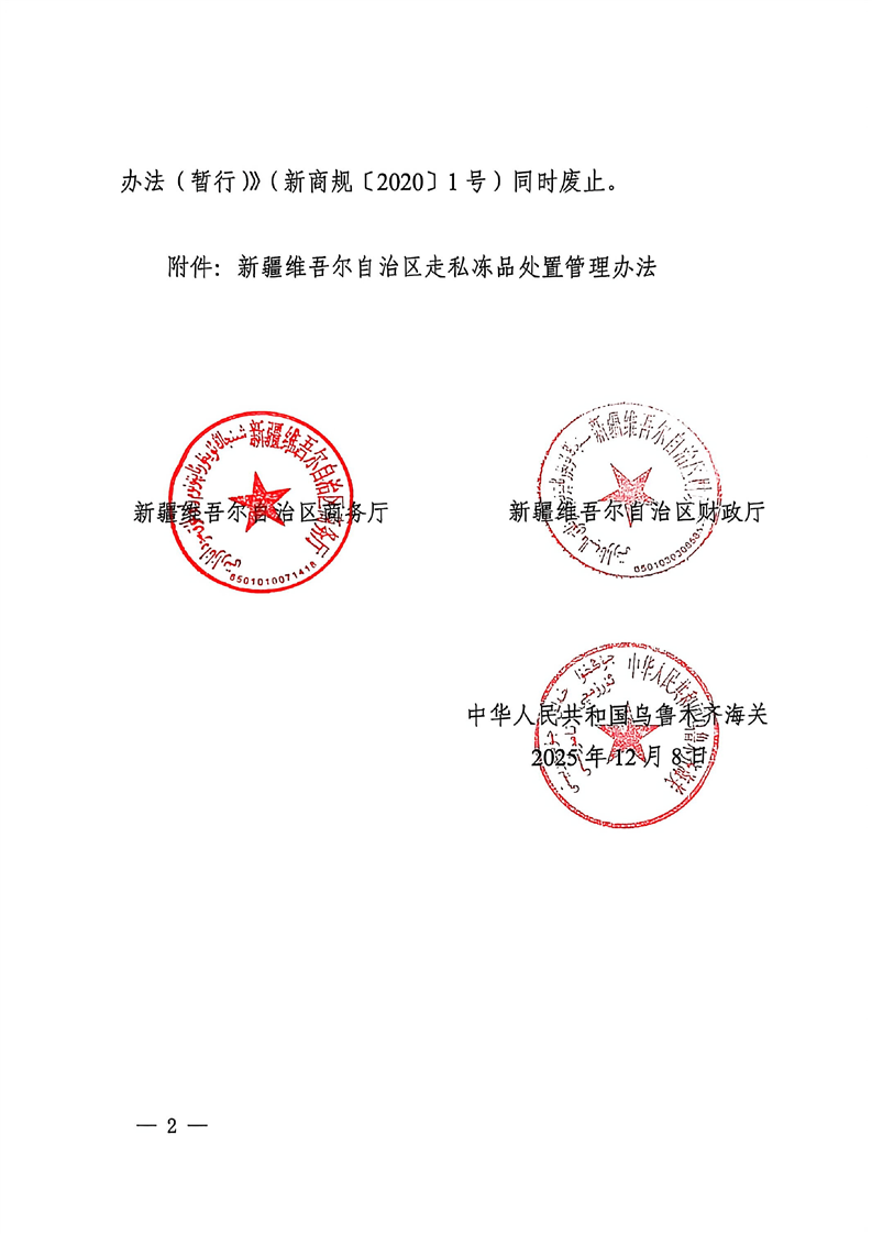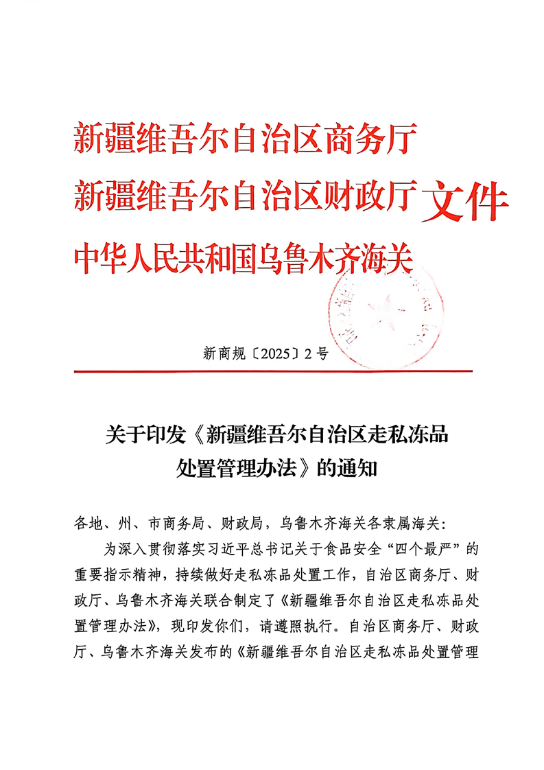 关于印发《新疆维吾尔自治区走私冻品处置管理办法》的通知(新商规〔2025〕2号) -h365官方网站
