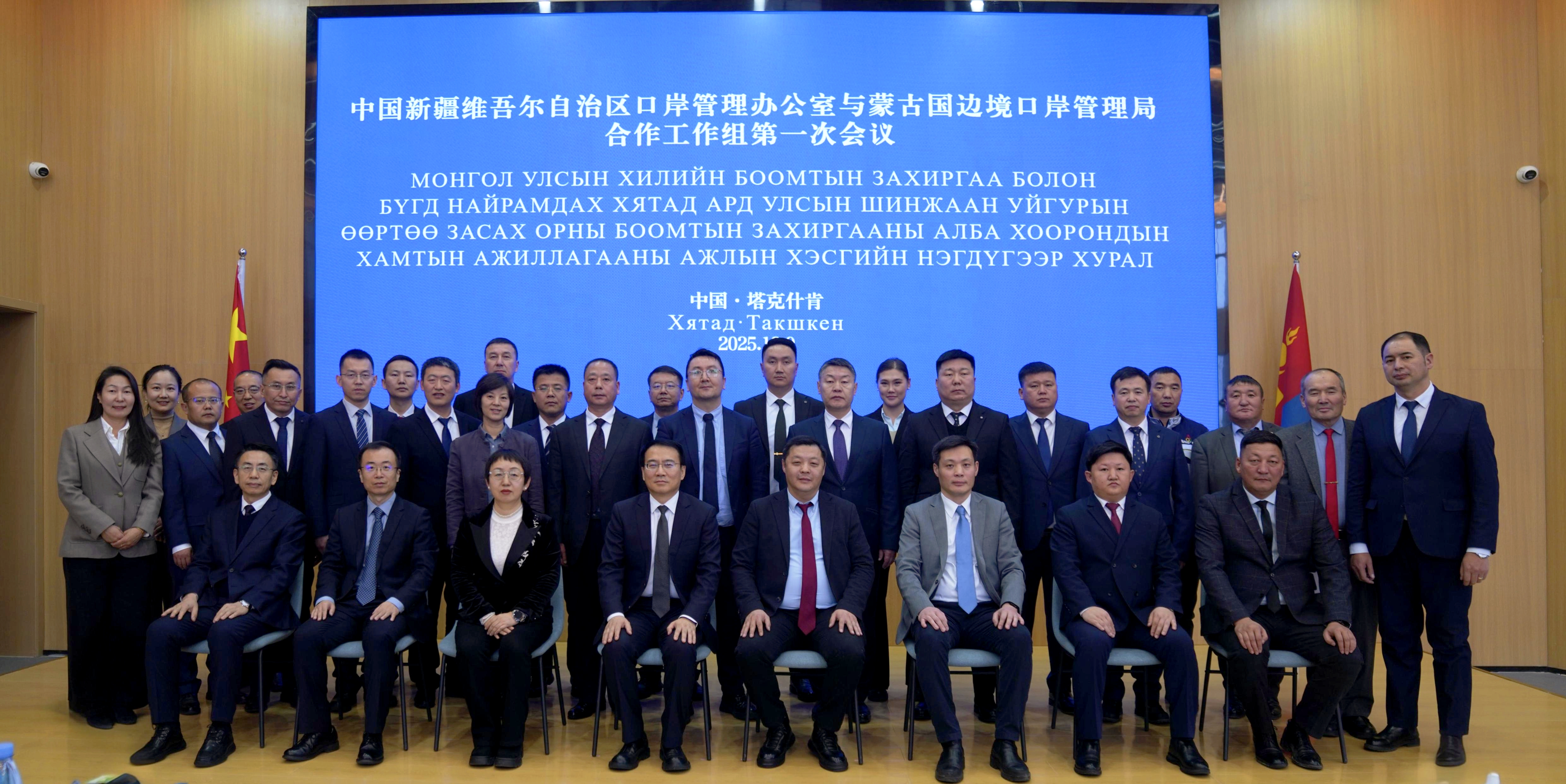为深入贯彻落实中蒙两国领导人关于深化全面战略伙伴关系的重要共识,推动中国新疆与蒙古国在口岸领域的务实合作。2025年12月9日,新疆维吾尔自治区口岸管理办公室与蒙古国边境口岸管理局在新疆塔克什肯口岸召开合作工作组第一次会议。自治区商务厅党组书记、副厅长李轩,蒙古国边境口岸管理局局长贝·巴特贺喜格共同主持。自治区口岸办、外办、交通运输厅、乌鲁木齐海关、新疆出入境边防检查总站、阿勒泰地区行署及对蒙4个口岸代表和蒙古国外交、海关、边检、口岸代表等共同参会。会前,双方代表团调研了口岸通关现场、新货运通道选址和工业园区重点企业。